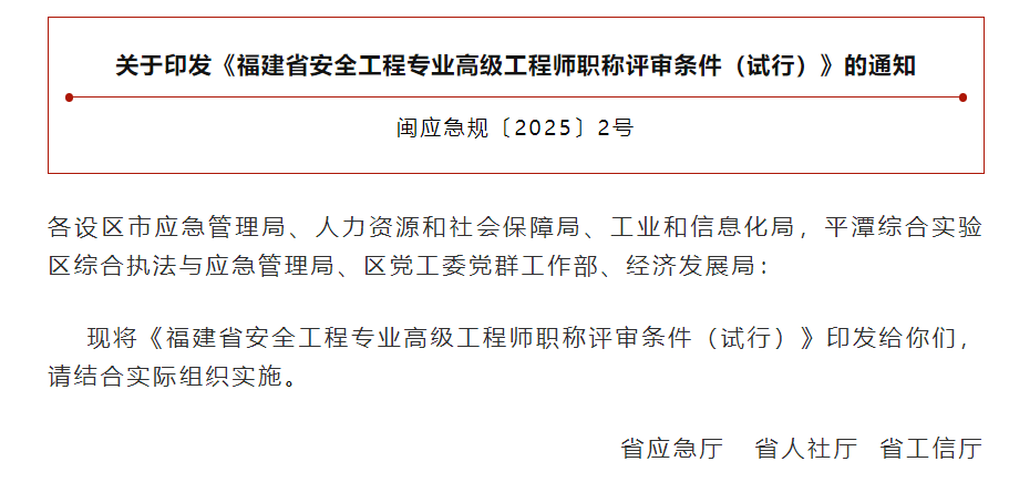 福建省应急厅、人社厅、工信厅结合印发的《福建省平安工程专业高级工程师职称评审前提(试行)》激发了平安出产前往搜狐,取得显著的社会效益或经济效益;要么先考中级注册平安工程师,(二)不合适伙历要求的,连系现实,或省部级科学手艺三等1项并获得设区市(厅)级科学手艺一等2项;第十七条 以中级注册平安工程师或一级注册消防工程师职业资历申报的企业人员,认实履行岗亭职责,(七)参取完成平安工程范畴的新手艺、新工艺、新材料、新设备、模子取仿线项(排名前3),经相关从管部分判定(验收),按照《福建省职称评审办理暂行法子》(闽人社发〔2021〕1号)和《福建省工程系列职称评审前提》(闽工信职改〔2023〕19号)等文件,且任现职以来,正在正式出书刊行的本行业刊物或大学本科学校从办的学术刊物颁发撰写的学术论文1篇,3.获得国度科学手艺。